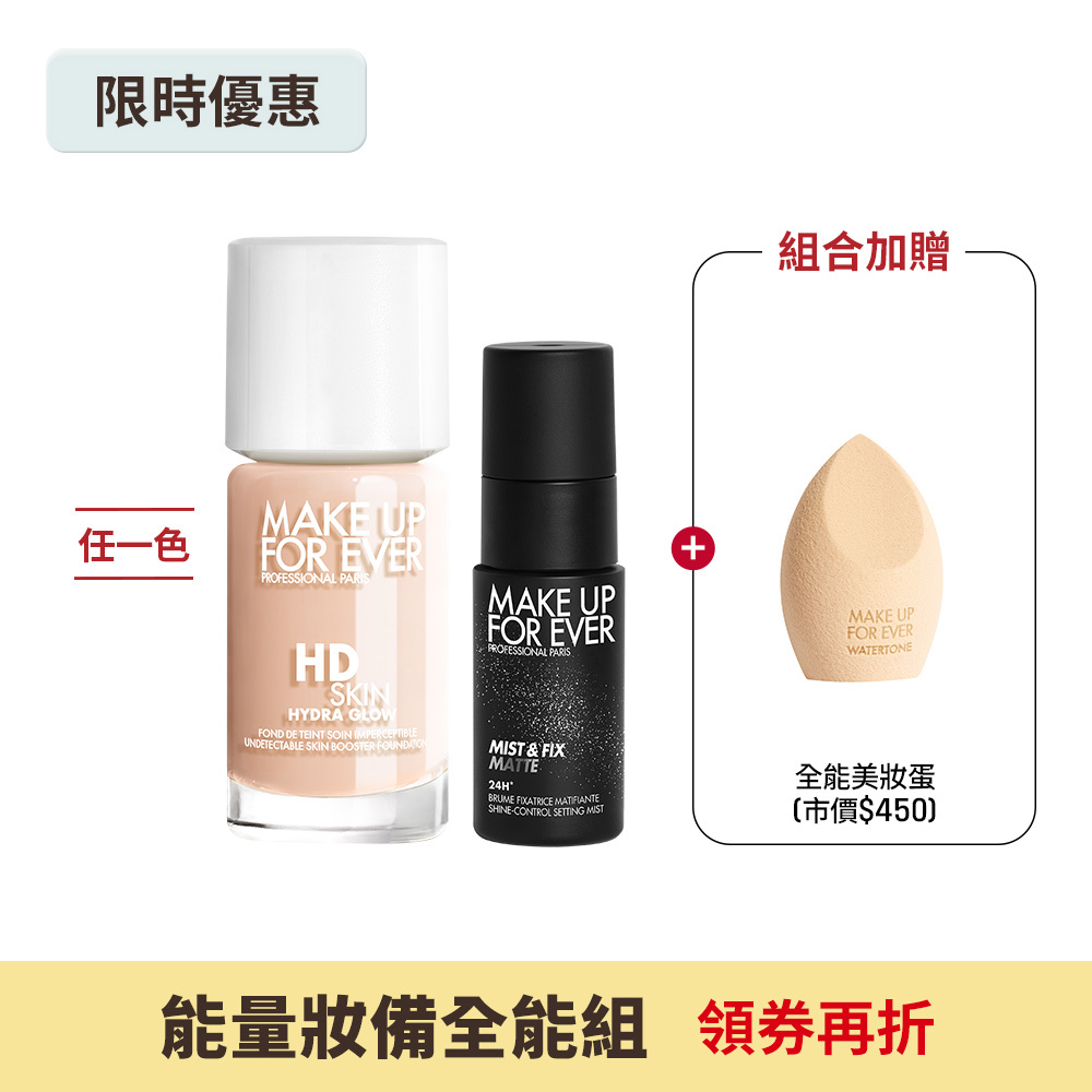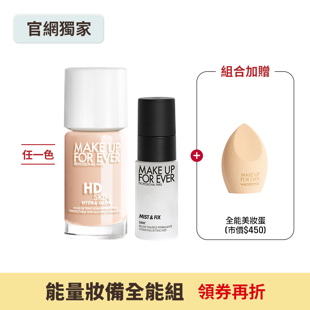 【能量妝備全能組】HD SKIN 粉無痕活潤精華粉底液30ml #能量粉底+超光肌活氧定妝噴霧30ml #活氧水+全能美妝蛋 - MAKE UP FOR EVER