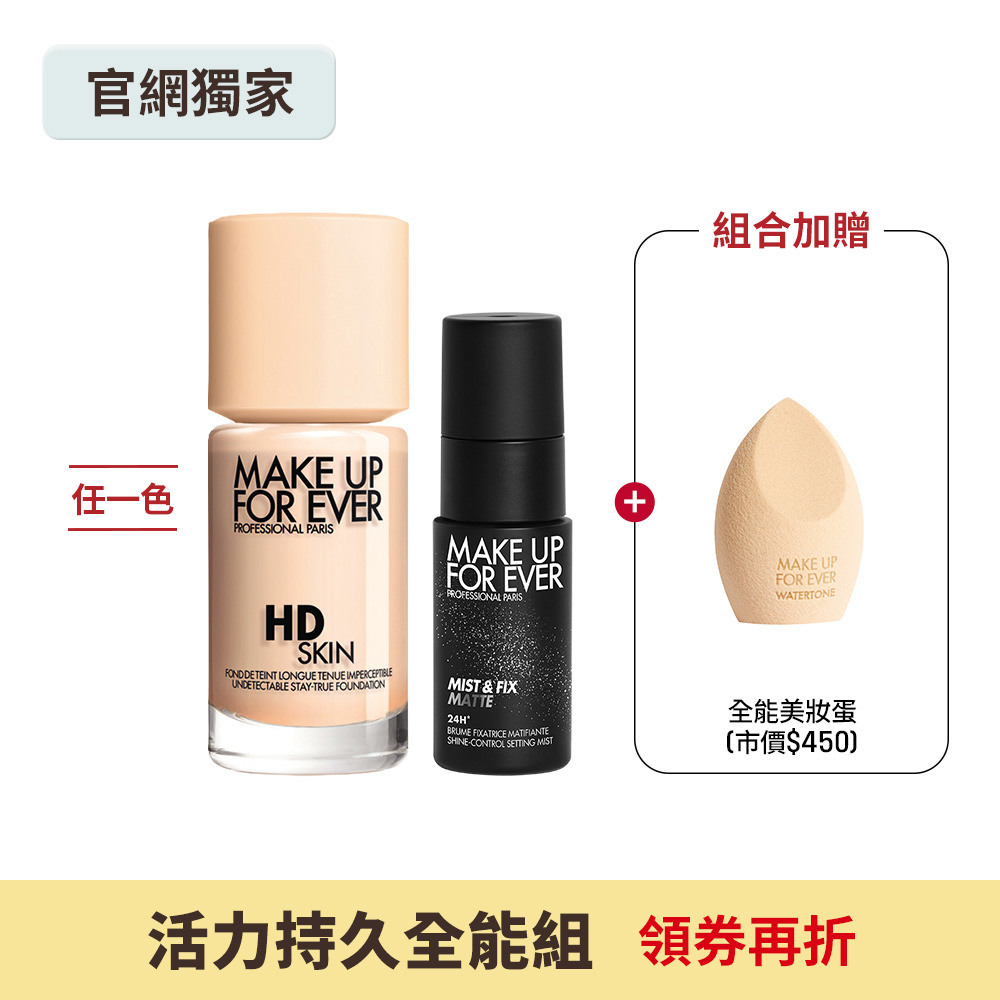 【活力持久全能組】HD SKIN 粉無痕持久粉底液 30ml+超光肌活氧定妝噴霧30ml #活氧水+全能美妝蛋 - MAKE UP FOR EVER