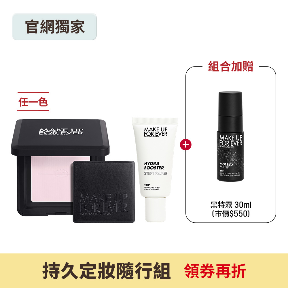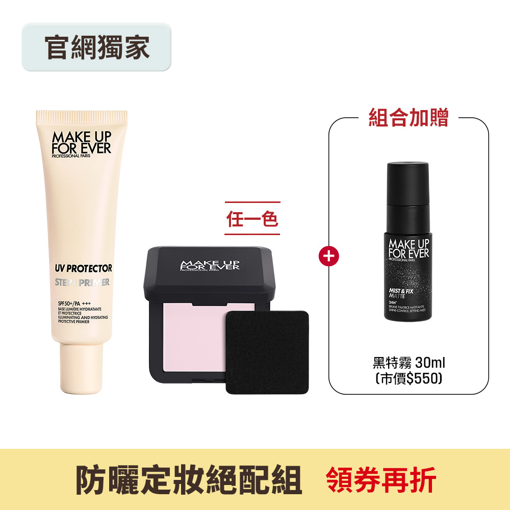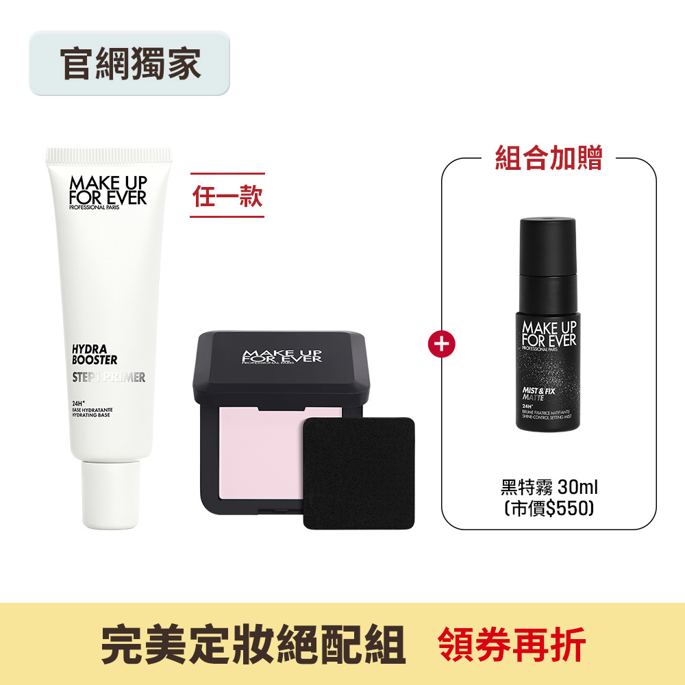 【完美定妝絕配組】STEP1 第一步妝前乳30ml(任選)+HD SKIN 粉無痕光圈蜜粉餅4.5g+超光肌控油定妝噴霧30ml #黑特霧 - MAKE UP FOR EVER