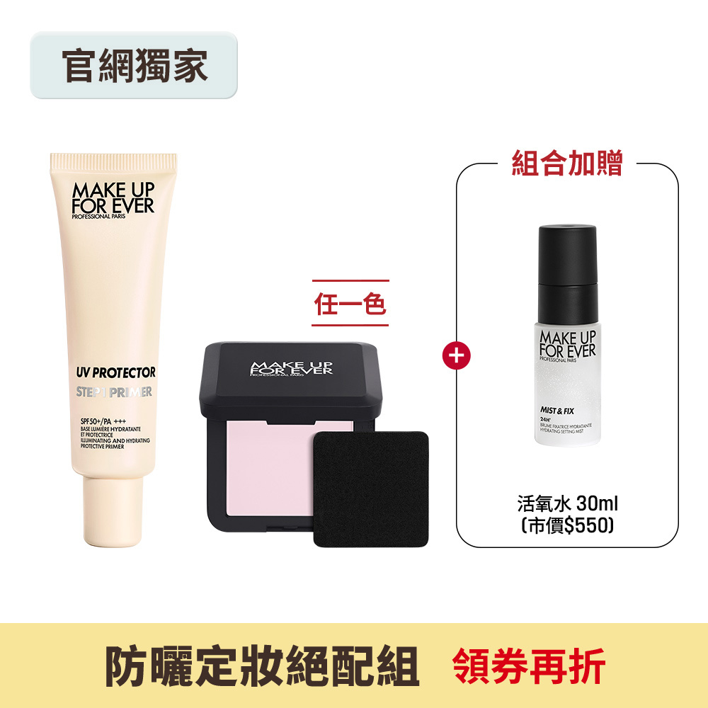 【完美定妝絕配組】STEP1 第一步妝前乳30ml(任選)+HD SKIN 粉無痕光圈蜜粉餅4.5g+超光肌活氧定妝噴霧30ml #活氧水 - MAKE UP FOR EVER