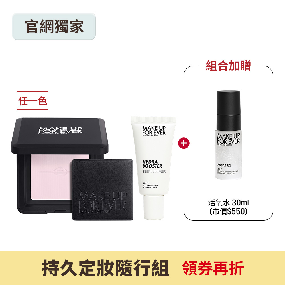 【持久定妝隨行組】HD SKIN 粉無痕光圈蜜粉餅10g+STEP1 第一步澎彈潤妝前乳15ml+超光肌活氧定妝噴霧30ml #活氧水 - MAKE UP FOR EVER
